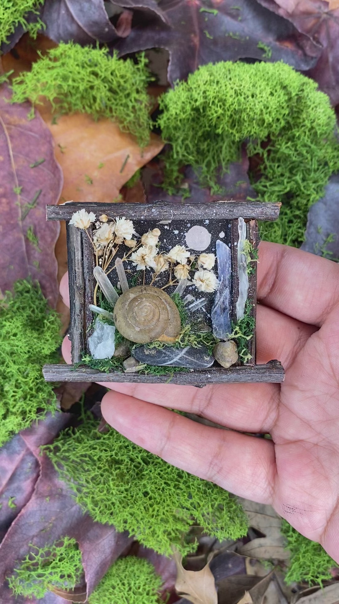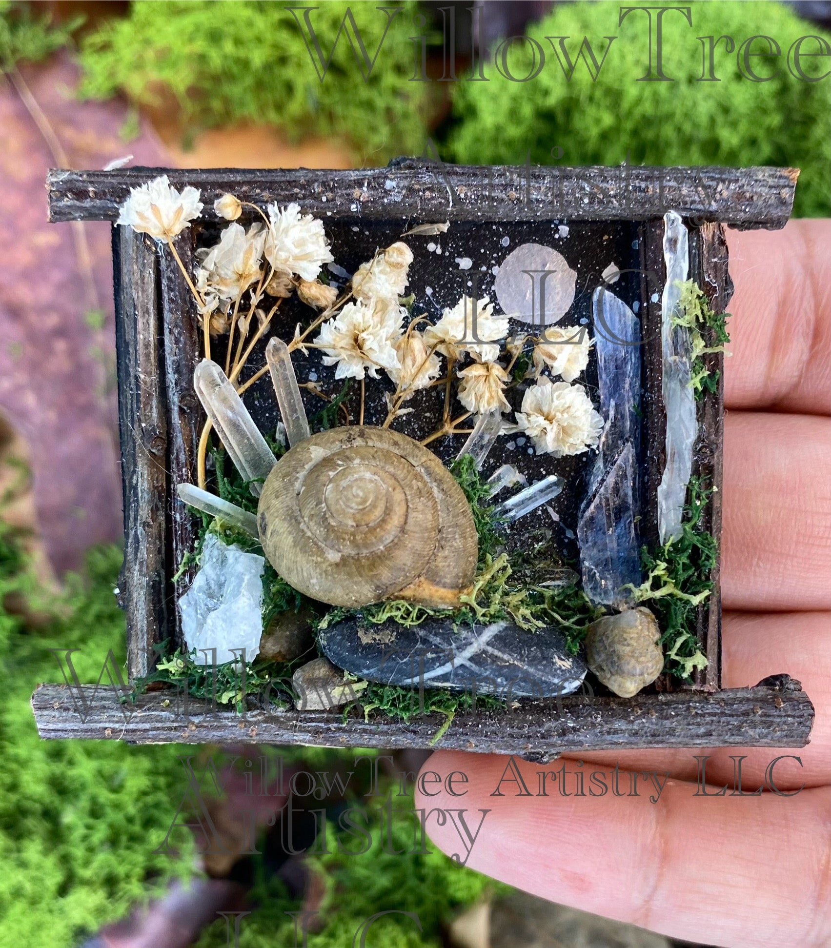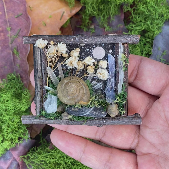 Materials: A real snail shell (ethically sourced and naturally passed in my garden), quartz crystals, blue kyanite blade, rocks/pebbles, moss, baby's breath dried flowers, surrounded by a Japanese cherry shrub stick frame on recycled cardboard painted with acrylic paint, held together by E-6000.